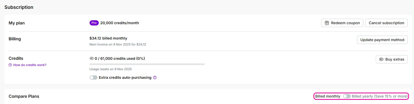 * 从月度订阅(Subscription)更改为年度订阅(Subscription),层级(Tier)相等或更高(例如,从 Pro 每月 10,000 积分更改为 Pro 每年 120,000 积分)