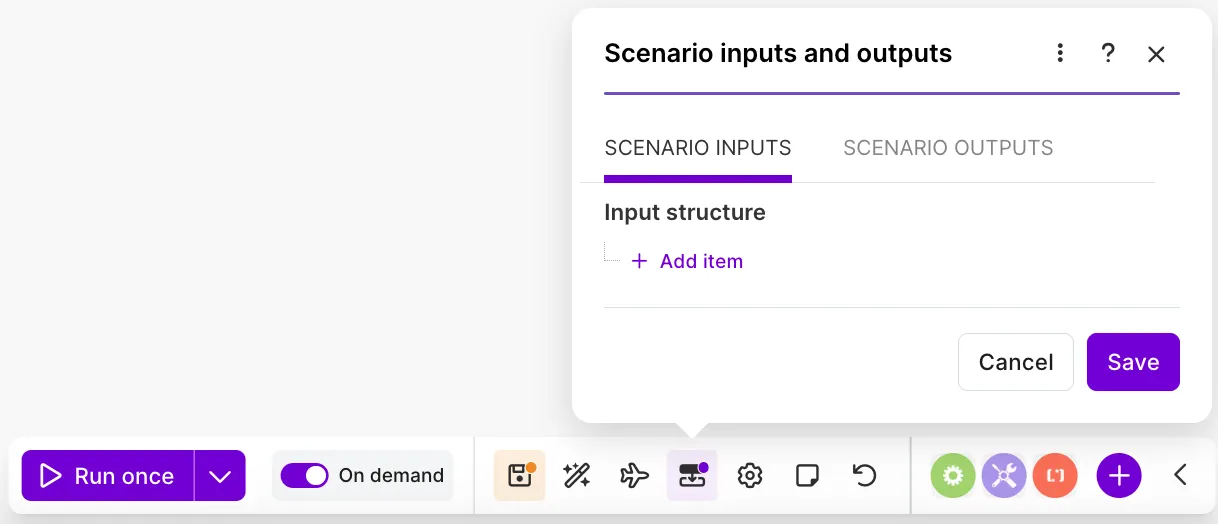 在构建与其它 scenario(场景)或外部系统通信的 scenario(场景)时,您需要 配置 scenario(场景)inputs(输入)和 outputs(输出)。这包括以下 scenario(场景): * 调用其它 scenario(场景)(subscenarios(子场景))* 通过 API 被外部系统触发