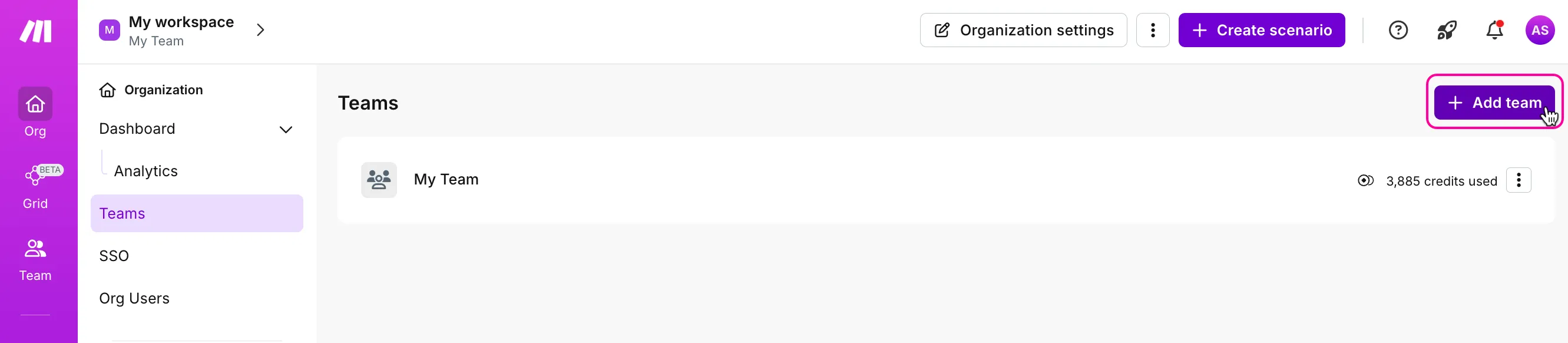 您可以监控每个团队(team)消耗的 credits(点数)和数据传输(data transfer)。由于场景(scenarios)始终属于团队(teams),其执行(execution)历史(history)也会针对每个团队(team)单独(separately)跟踪(tracked)。